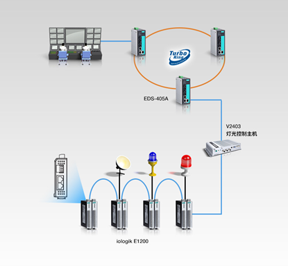 Moxa為客戶制定了高桿燈光控制的整套通訊解決方案,采用Moxa的工業(yè)級嵌入式計算機V2403作為控制主機,以遠程以太網(wǎng)I/O采集器ioLogik E1212采集前端I/O的數(shù)據(jù),再通過工業(yè)級以太網(wǎng)交換機EDS-405A將數(shù)據(jù)匯聚并上傳,從到達到可靠穩(wěn)定及時的高桿燈光控制。