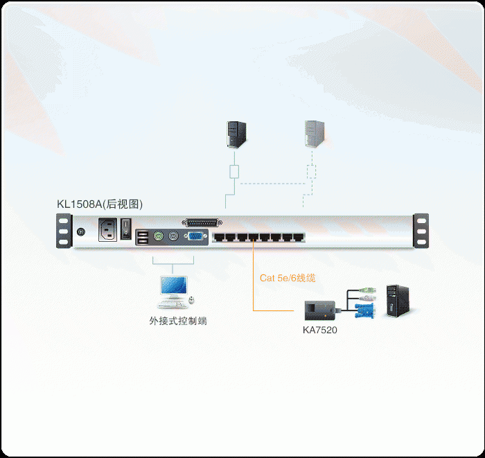 為了提高可靠度與效率,KL1508A采用RJ-45接頭與Cat 5e/6線纜連接服務(wù)器。另外,通過連接各種KVM電腦端模塊,KL1508A可支持包括PC、Mac、Sun電腦、以及串口設(shè)備等多種安裝組合。