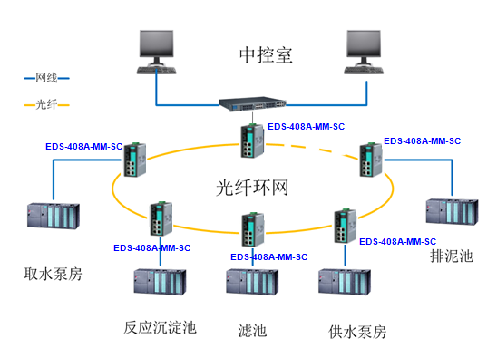 2. 在每個反映池安裝一臺NIOXA EDS-408A-MM-SC,通過光纖組成光纖冗余網(wǎng)絡(luò),然后匯聚給中控室。