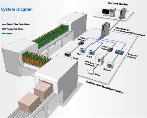 一家機(jī)械制造商,專業(yè)從事計劃、開發(fā)、制造、安裝機(jī)械設(shè)備。正進(jìn)行灌裝、貼標(biāo)及封裝生產(chǎn)線的開發(fā)制造。作為一家以太網(wǎng)控制機(jī)械自動化的創(chuàng)新者,公司正在擴(kuò)展他們的機(jī)械集成方案,通過在單個機(jī)械或者機(jī)組中植入工業(yè)網(wǎng)絡(luò),力圖為機(jī)械控制行業(yè)樹立典范。該公司想要找優(yōu)質(zhì)的符合工業(yè)應(yīng)用強(qiáng)度的以太交換機(jī),為此生產(chǎn)線線及其他產(chǎn)品生產(chǎn)線組成“內(nèi)部網(wǎng)絡(luò)”。