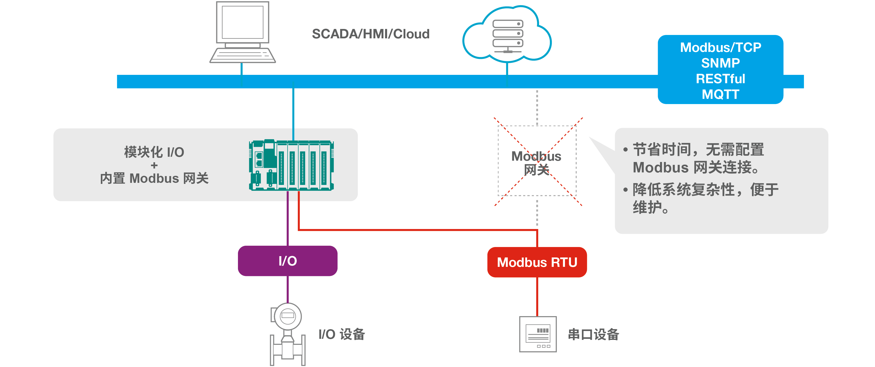 ioThinx 4510 支持 Modbus RTU Master,可通過串口測量儀采集現(xiàn)場數(shù)據(jù)。數(shù)據(jù)采集完成后,可將串口數(shù)據(jù)轉換為 Modbus TCP、SNMP、MQTT 和 RESTful 等多種協(xié)議,供用戶自主選擇。 這種二合一的設計降低了系統(tǒng)復雜性,減少了網絡拓撲所需空間和總體安裝時間。另外,還可以將傳統(tǒng)設備連接至以太網,使用更常用的協(xié)議訪問這些設備,從而延長設備使用時間。