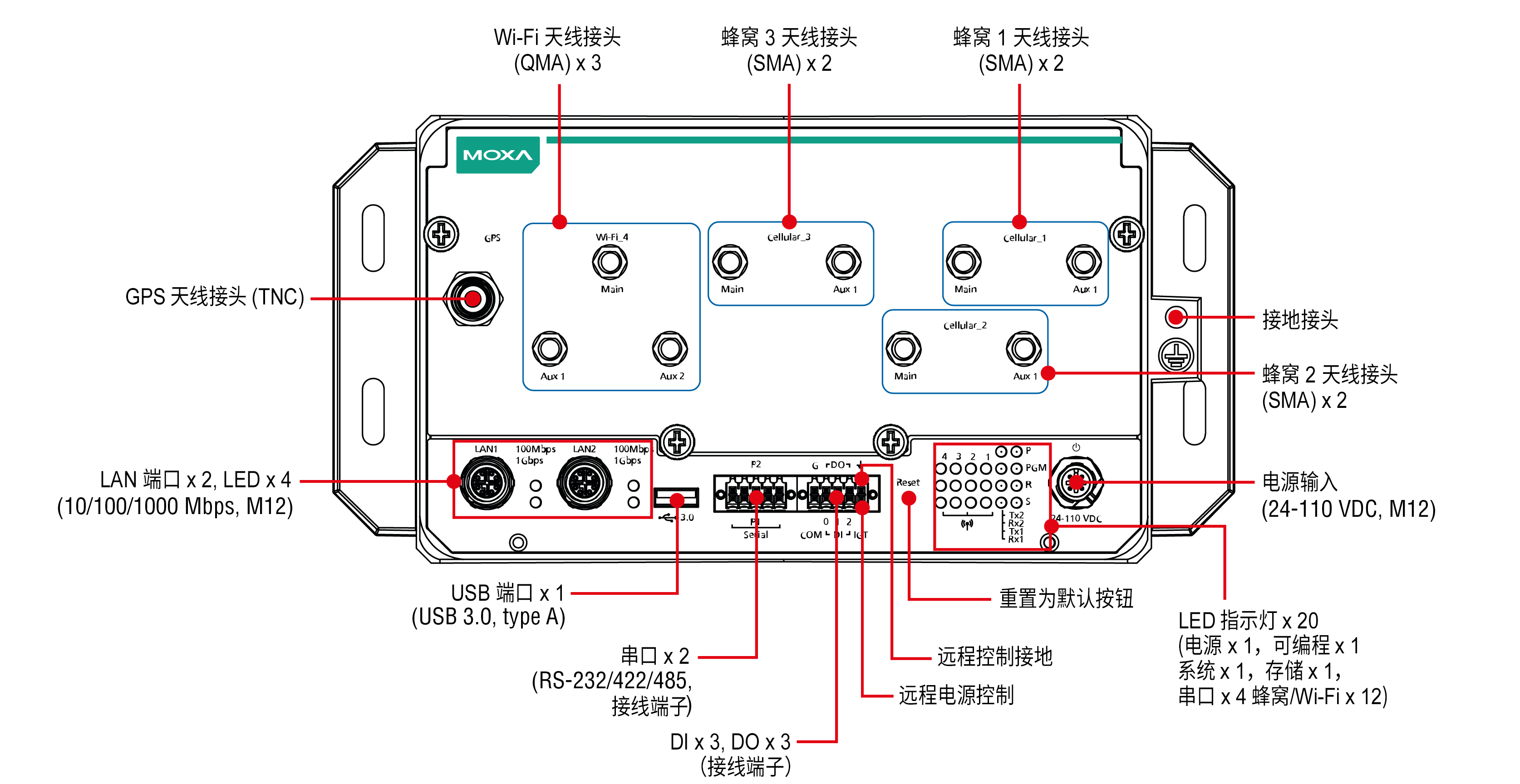 UC-8580 提供兩種不同種類的天線接頭可選。SMA 型號支持所有類型的 SMA 接頭。QMA 型號支持用于 GPS 的 TNC 接頭和用于 Wi-Fi/蜂窩模塊的 QMA 接頭,并配備 4 個(gè)用于安裝無線模塊的插槽。 其中 3 個(gè)插槽支持 4G LTE 模塊,1 個(gè)插槽支持 Wi-Fi 模塊。每個(gè) 4G/LTE 模塊均配備 2 個(gè) SIM 卡插槽,并可利用內(nèi)置的 MIRF 2.0(Moxa 設(shè)備遠(yuǎn)程管理平臺(tái),可支持無線管理),來實(shí)現(xiàn)冗余蜂窩網(wǎng)絡(luò)通信或選擇 SIM 卡的地理圍欄。
