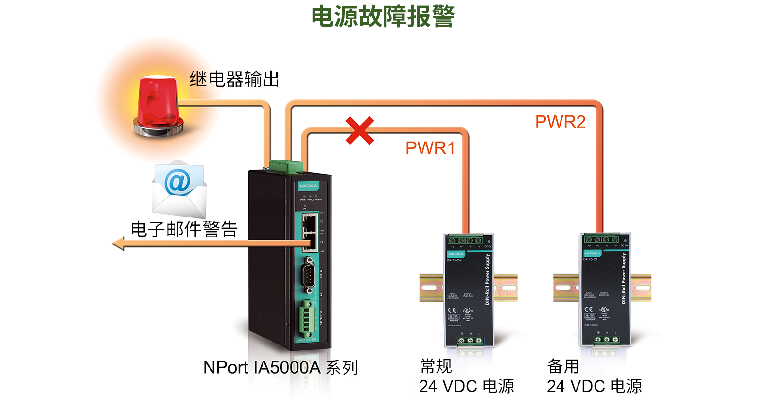 NPort IA5000A系列設備聯(lián)網(wǎng)服務器支持雙電源輸入,可同時連接兩臺直流電源。如果一個電源故障,另一個備用電源將會自動切換。冗余雙電源輸入可確保您的設備聯(lián)網(wǎng)服務器連續(xù)運行。