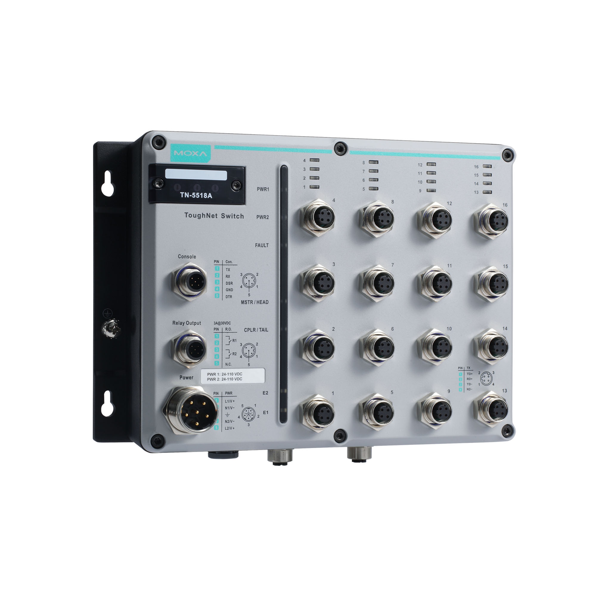 ToughNet TN-5500A 系列 M12 網(wǎng)管型工業(yè)以太網(wǎng)交換機專為嚴苛環(huán)境中的工業(yè)應用而設計。 TN-5500A 系列交換機通過牢固的 M12 接頭緊密地、牢靠的連接,可確保網(wǎng)絡設備穩(wěn)定地運行,而不需擔憂外在環(huán)境的振動和沖擊等干擾所造成的問題。TN-5500A 系列配備 8 個或 16 個百兆以太網(wǎng) M12 端口,支持包含 8 個符合 IEEE 802.3at/af 標準的 PoE(以太網(wǎng)供電)端口、2 個在底部的端口可提供千兆以太網(wǎng)接口,以及一個帶旁路中繼功能可選。PoE 交換機可作為供電設備 (PSE),每個端口供電可達 30 W 功率,適合為符合 IEEE 802.3at/af 標準的受電設備供電,如 IP 監(jiān)控、無線接入和 IP 電話。