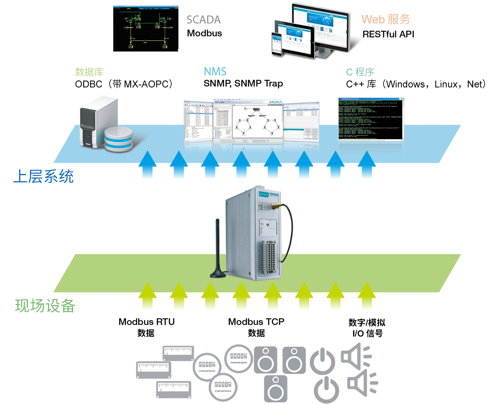 CGI 命令、Modbus TCP Client (Master)、Modbus TCP Server (Slave)、Moxa AOPC(主動(dòng)標(biāo)簽)、MXIO 庫(kù)、RESTful API、SNMPv1/v2c/v3、SNMPv1/v2c Trap