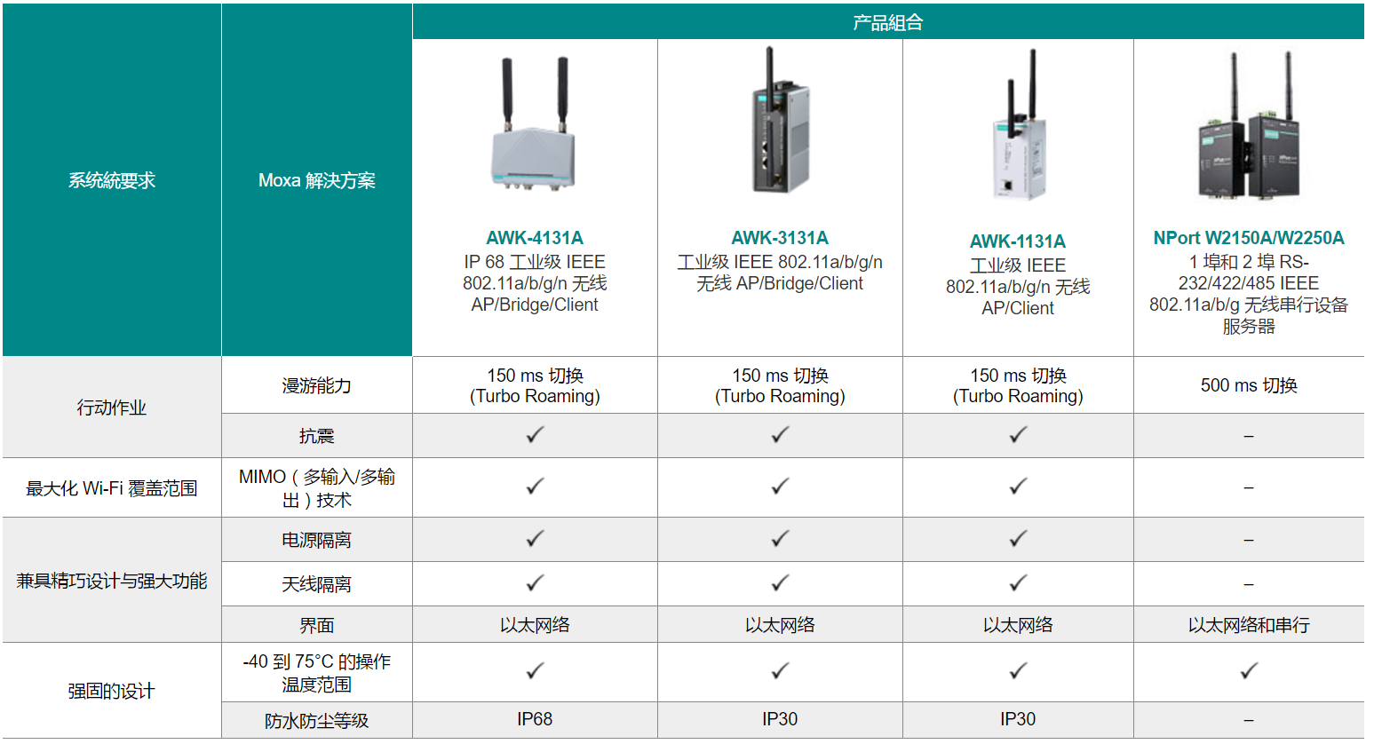 Moxa的無線解決方案提供了多種功能和界面,可滿足您不同的應(yīng)用需求。下表列出AGV與AS/RS應(yīng)用的部分共同要求,以及由AWK-A系列無線設(shè)備提供的解決方案: