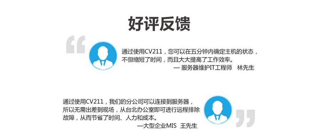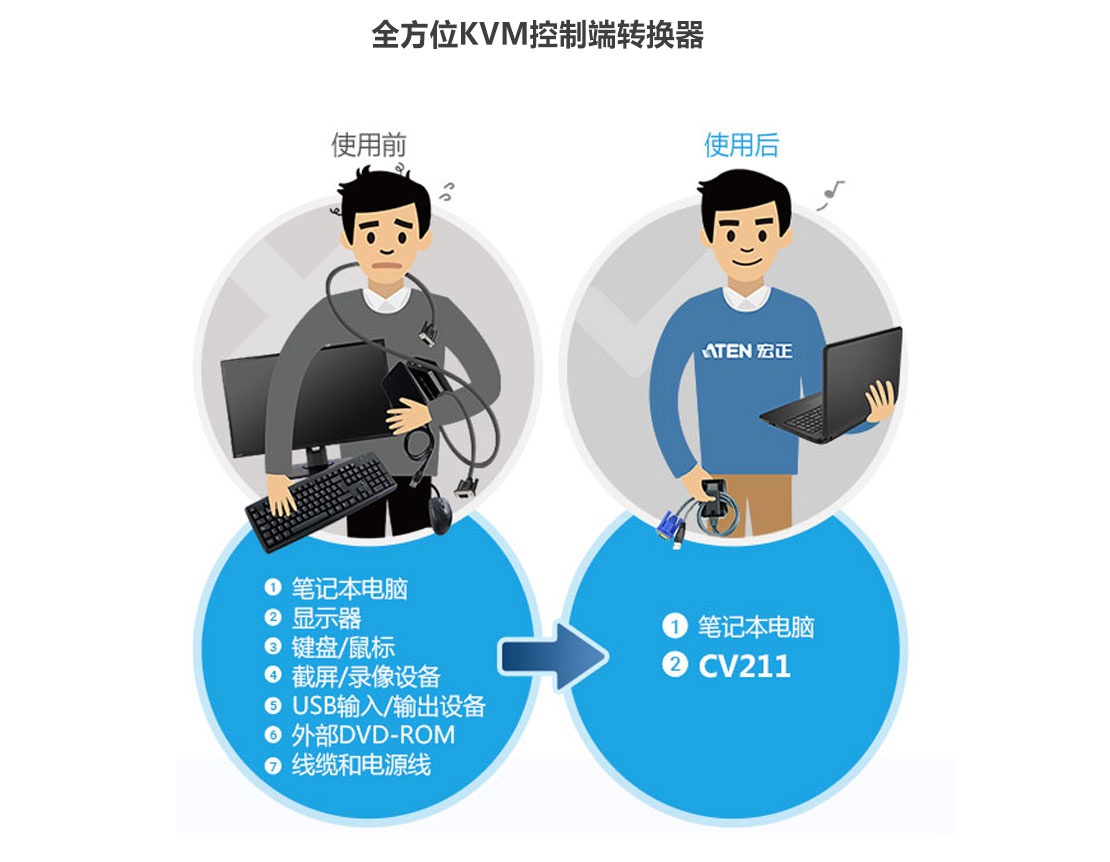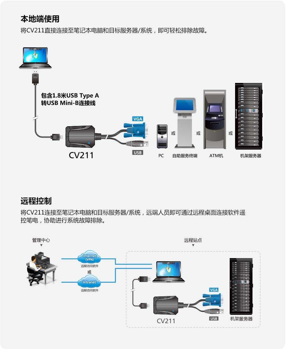 CV211為一款便攜式KVM控制器。通過CV211連接筆記本和服務(wù)器、一般電腦、公共信息站(kiosk)或ATM自動(dòng)提款機(jī),這些設(shè)備的作業(yè)系統(tǒng)視窗畫面便可在筆記本的屏幕中顯示。因?yàn)镃V211使用一條USB 2.0及VGA復(fù)合線纜連接其它電腦設(shè)備,就可讓用戶擁有該設(shè)備BIOS層級(jí)的訪問權(quán)限,并且可進(jìn)行雙向檔案傳輸,通過熱鍵宏快速執(zhí)行功能操作,也支持操作畫面的影像錄制和屏幕快照截圖。讓CV211搭配筆記本就可以完全取代生產(chǎn)線和機(jī)房中用來乘載電腦周邊設(shè)備的笨重推車,提升用戶的工作效率和機(jī)動(dòng)性,非常適合需要隨時(shí)隨地都能進(jìn)行維護(hù)系統(tǒng)工作的IT專業(yè)人員。