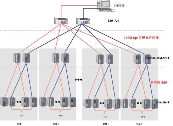 奧運(yùn)場(chǎng)館水立方藝術(shù)燈光景觀項(xiàng)目的網(wǎng)絡(luò)架構(gòu)圖所示:網(wǎng)絡(luò)采用雙網(wǎng)架構(gòu),分為三層。設(shè)備層由188臺(tái)EDS-316-T交換機(jī)組成,主要負(fù)責(zé)連接現(xiàn)場(chǎng)的LED燈光控制器,控制景觀燈的開(kāi)關(guān)和顏色。匯聚層由16臺(tái)EDS-516A-MM-SC組成,負(fù)責(zé)連接現(xiàn)場(chǎng)層的EDS-316-T。核心層使用兩臺(tái)EDS-726模塊化交換機(jī)組成,負(fù)責(zé)連接匯聚層的EDS-516A-MM-SC和服務(wù)器。