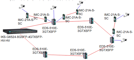 中控室交換機(jī)選用IKS-G6524A全千兆機(jī)架式交換機(jī),根據(jù)項目要求配置6個千兆單模光口,4個光口用于與隧道交換機(jī)組冗余網(wǎng)絡(luò),2個光口用于與變電所監(jiān)控室和隧道監(jiān)控站核心交換機(jī)組冗余網(wǎng)絡(luò))。隧道內(nèi)交換機(jī)選用EDS-510E-3GTXSFP系列交換機(jī),配置2個千兆單模光口,用于組建隧道內(nèi)冗余環(huán)網(wǎng)。