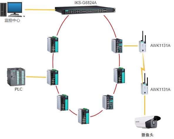 水廠的自控系統(tǒng)包括在線檢測儀表、安防系統(tǒng)、門禁系統(tǒng)、電話系統(tǒng)等,客戶希望在運行管理上實現(xiàn)無人或少人值守進行生產(chǎn),網(wǎng)絡的穩(wěn)定性尤為重要。Moxa的環(huán)網(wǎng)模式提供了很好的解決方案,當網(wǎng)絡中出現(xiàn)一條鏈路故障,都不影響通信。