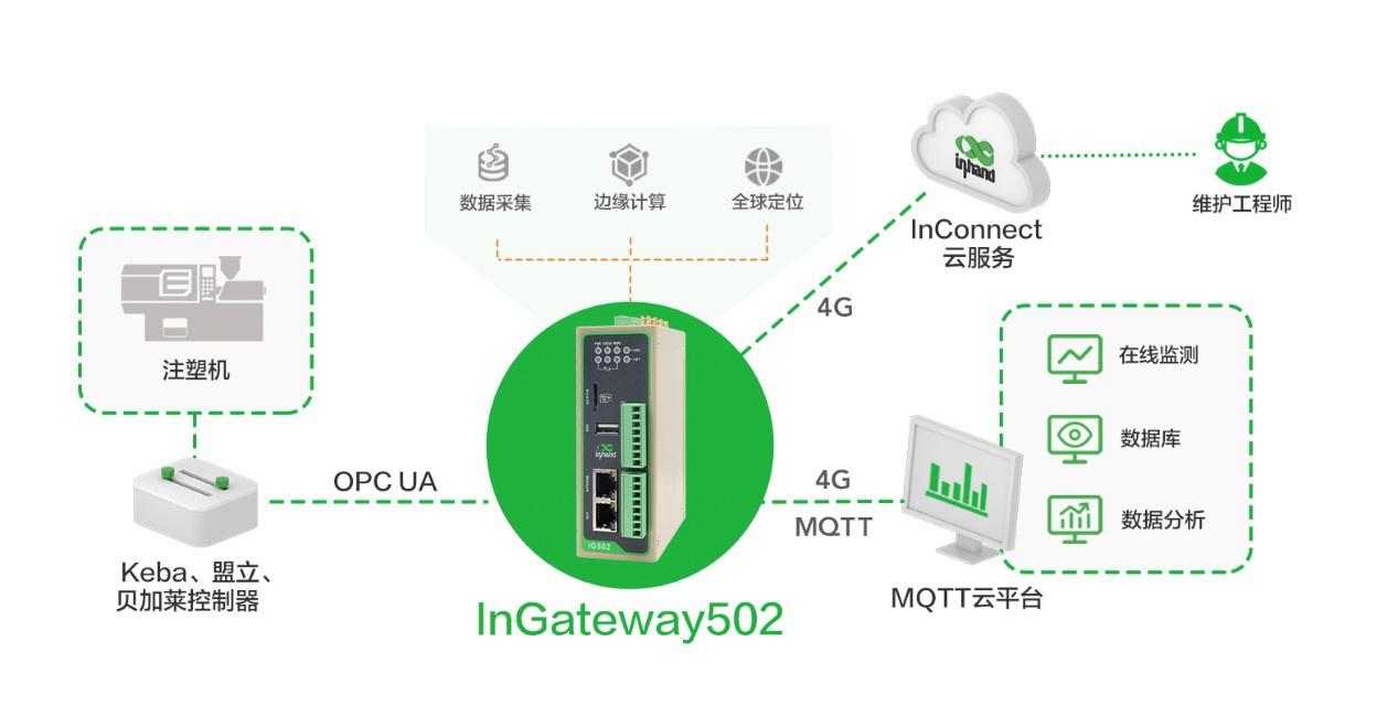 現(xiàn)場的注塑機通過以太網(wǎng)接口和邊緣計算網(wǎng)關(guān)IG502連接,邊緣計算網(wǎng)關(guān)IG502通過OPC UA協(xié)議采集控制器的數(shù)據(jù),通過MQTT方式把數(shù)據(jù)上傳至客戶的云平臺。