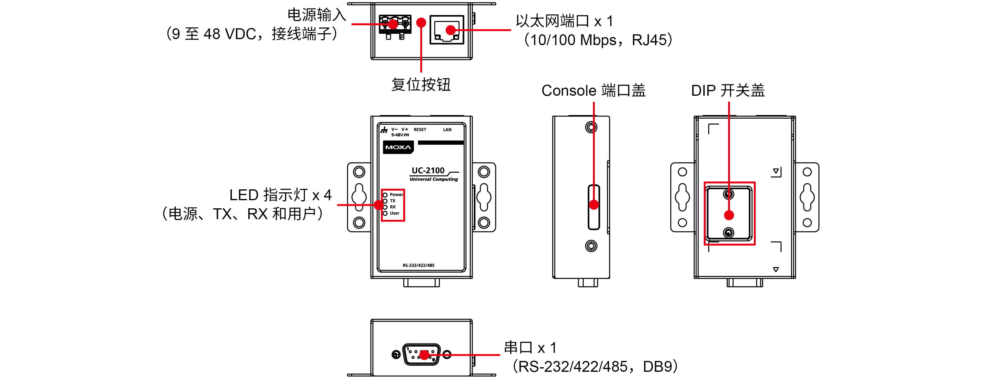 用于串口配置的復(fù)位按鈕和 DIP 撥碼