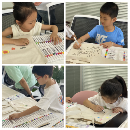 活動(dòng)開始我們給每位小朋友分發(fā)了丙烯筆和布袋,小朋友們發(fā)揮自己的想象力把對(duì)開放日的快樂畫在布袋上。