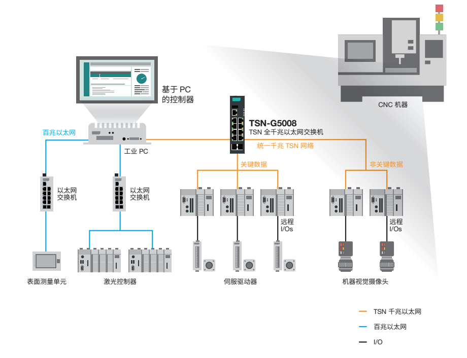 TSN-G5008 交換機(jī)將遠(yuǎn)程 I/O 連接到機(jī)器視覺攝像頭,以便將信息反饋給工業(yè)計(jì)算機(jī),解決了過去關(guān)鍵數(shù)據(jù)受限于傳統(tǒng)以太網(wǎng)標(biāo)準(zhǔn)無(wú)法在同一條線路上傳輸?shù)膯栴}。