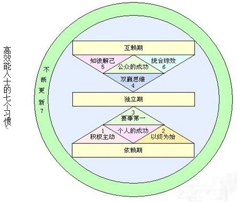 課程開始,老師便用了一張?zhí)貏e的圖讓大家迅速了解并記住了“高效能人士的七個習慣”——積極主動、以終為始、要事第一、雙贏思維、知彼解己、統(tǒng)合綜效、不斷更新。有了這張清晰的架構(gòu)圖,后面每一個習慣就能更系統(tǒng),更深入的掌握。