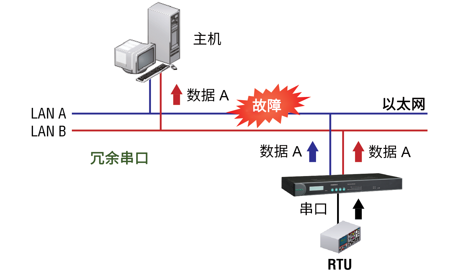 CN2600 的雙網(wǎng)口可設(shè)置為冗余“雙主機”模式。這種情況下,兩個網(wǎng)絡(luò)(圖中的 LAN A 和 LAN B)分別連接至不同主機。即使其中一臺主機意外宕機,另一臺主機仍然可以繼續(xù)與 CN2600 連接的串口設(shè)備進行通信。