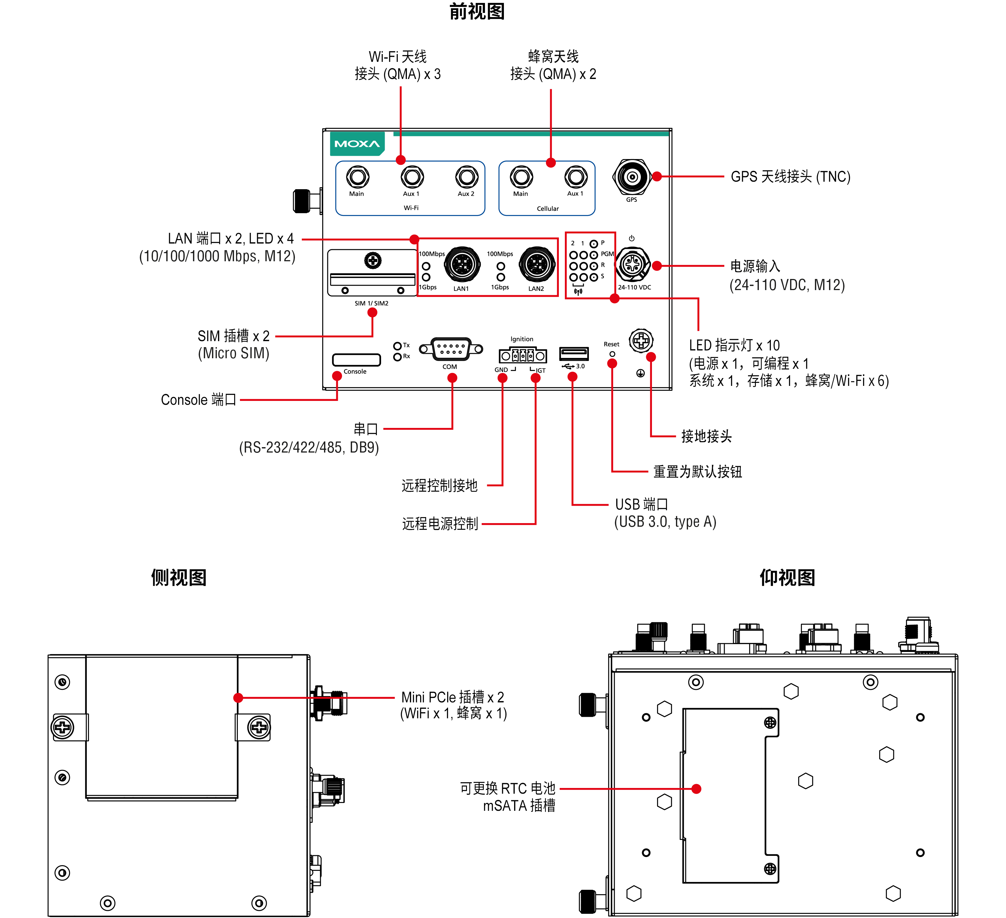 UC-8540 配備 1 個帶 USB 信號的 miniPCIe 插槽,用以支持 4G/LTE 模塊,以及 1 個帶 PCIe/USB 信號的插槽,可支持 Wi-Fi 模塊。4G/LTE 模塊配備 2 個 SIM 卡插槽,并可利用內(nèi)置的 MIRF 2.0 (Moxa 設(shè)備遠(yuǎn)程管理平臺,可支持無線管理),來實現(xiàn)冗余蜂窩網(wǎng)絡(luò)通信或選擇 SIM 卡的地理圍欄。