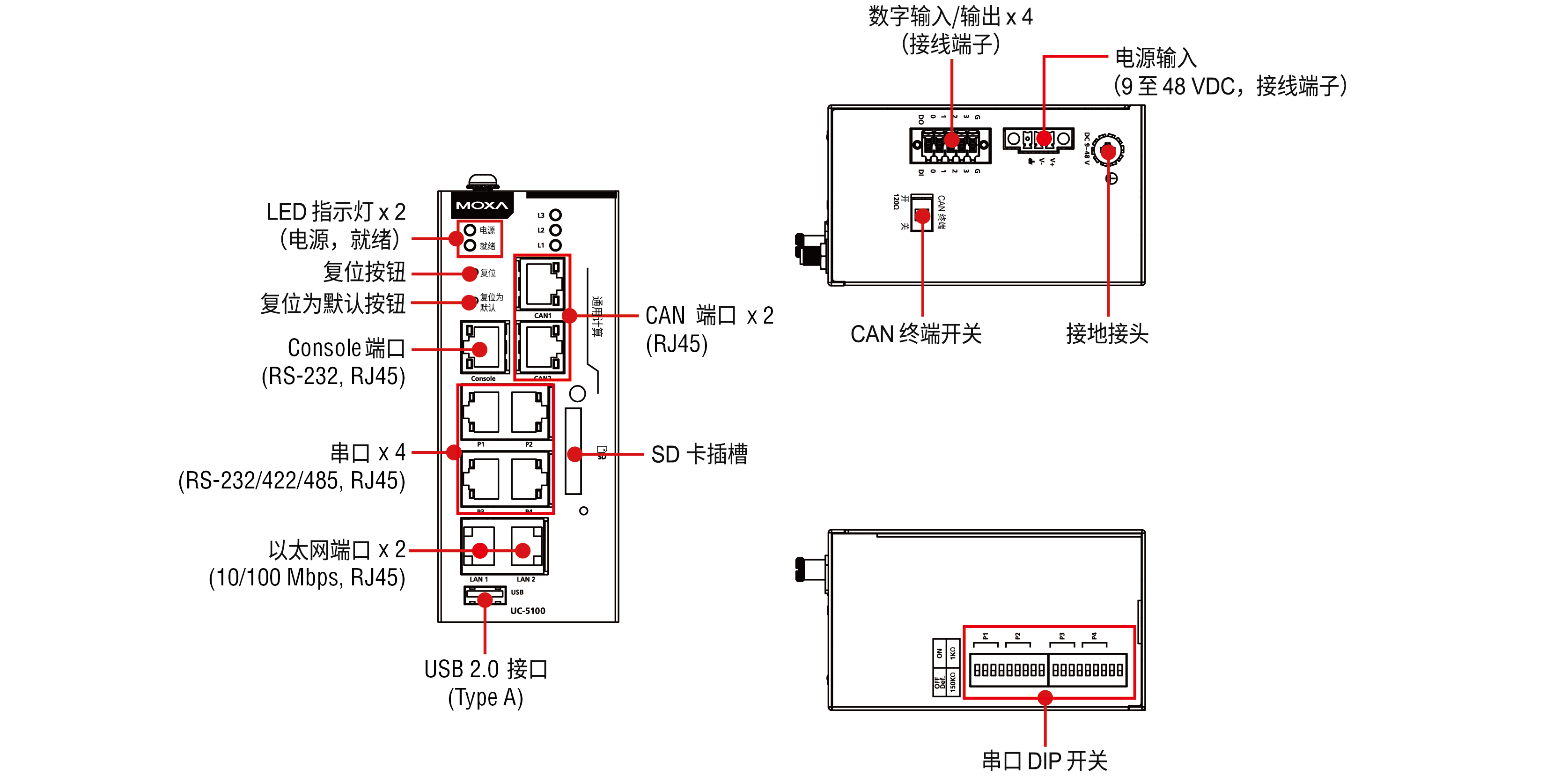按鈕: 復(fù)位按鈕,可用于配置串口和 CAN 端口的 DIP 開關(guān)