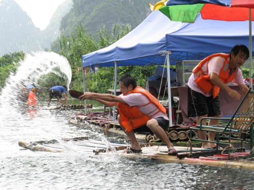 30號上午,我們安排去素有“小漓江”之稱的遇龍河漂流。兩兩一個竹排,順流而下,兩岸群峰疊聳、綠樹叢生,田野縱橫,村莊錯落,可以觀賞到遇龍橋、犀牛望月,穿山古寨、歸義城遺址、五指山、雙流口、駿馬凌空等風(fēng)光勝跡,是陽朔風(fēng)景又一佳境。當(dāng)然漂流中的水仗是必不可少的,早在上竹排之前,大家就為自己選配好了武器,誰勝誰負,很難有定論。