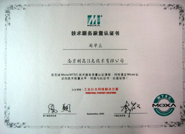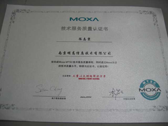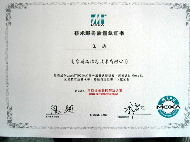 2003年9月,我公司王濤、周早立、陳志堅(jiān)三人順利通過了MOXA科技MTSC(MOXA Technical Support Center MOXA技術(shù)支持中心)資格認(rèn)證考試,為我公司贏得了MTSC認(rèn)證牌,并且獲得了個(gè)人及集體總分第一的好成績,得到MOXA及我公司的嘉獎。
