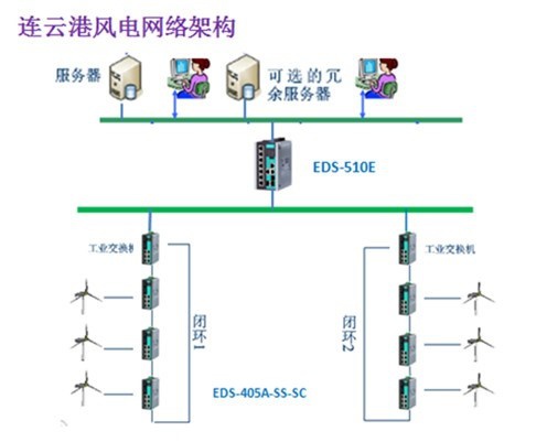 每個風(fēng)機(jī)內(nèi)放置一臺交換機(jī)(EDS-408A-SS-SC),用光口組環(huán),電口接監(jiān)控攝像機(jī)。所有風(fēng)機(jī)組成兩個環(huán),兩個環(huán)網(wǎng)連接一臺匯聚交換機(jī)(EDS-510E)上面?zhèn)鹘o監(jiān)控中心。在每臺風(fēng)機(jī)內(nèi)部配一臺EDS-408A-SS-SC,因為其堅固的設(shè)計,可靠的工業(yè)品質(zhì)以及MOXA特有的Turbo Ring技術(shù),可以實(shí)現(xiàn)工業(yè)上冗余備份,快速恢復(fù),從而保證系統(tǒng)通信安全。在匯聚端采用的是MOXA EDS-510E交換機(jī),其既有千兆combo口,又有百兆電口,千兆口可以向上級聯(lián),從而保證下面的視頻數(shù)據(jù)不會存在延遲。百兆口還可以接入一些其他設(shè)備。MOXA交換機(jī)環(huán)網(wǎng)技術(shù)Turbo Ring,性能穩(wěn)定,恢復(fù)時間快(20ms以內(nèi))。